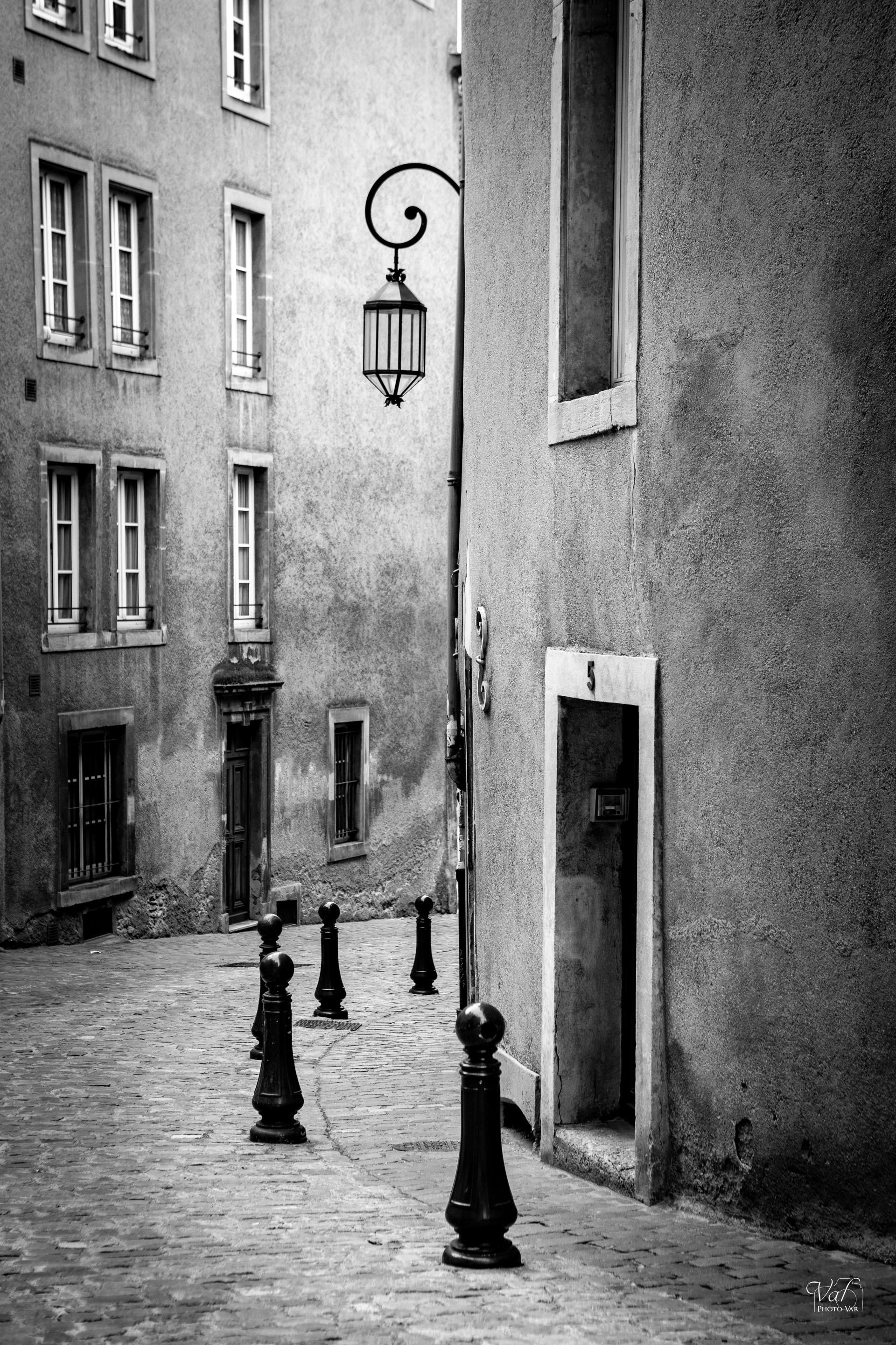Rue de Metz, photographie noir et blanc, ville Française traversée par la Moselle.