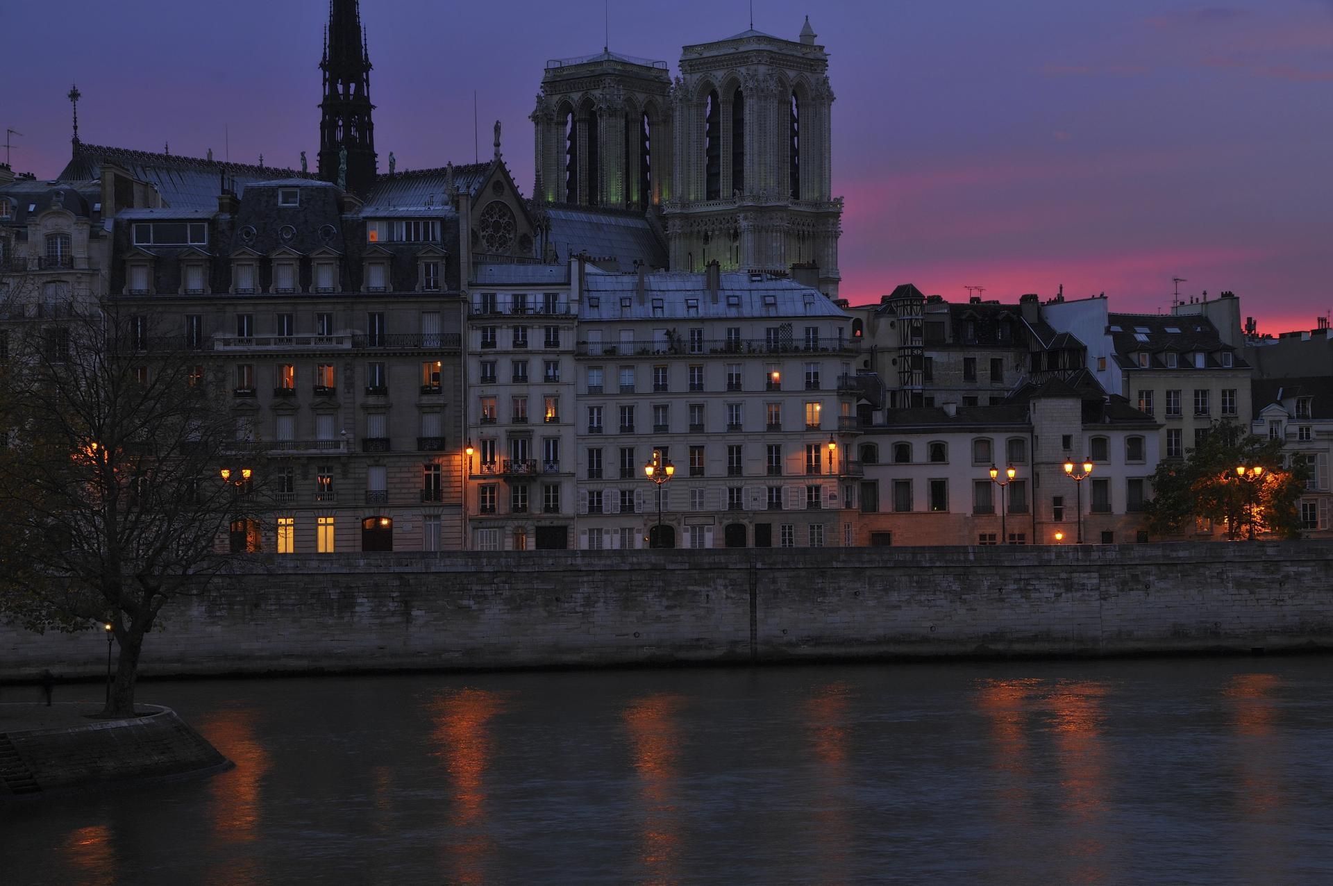 Notre-Dame et les bâtiments sur le quai aux Fleurs au crépuscule vus du pont Louis-Philippe sur la Rive droite de la Seine.