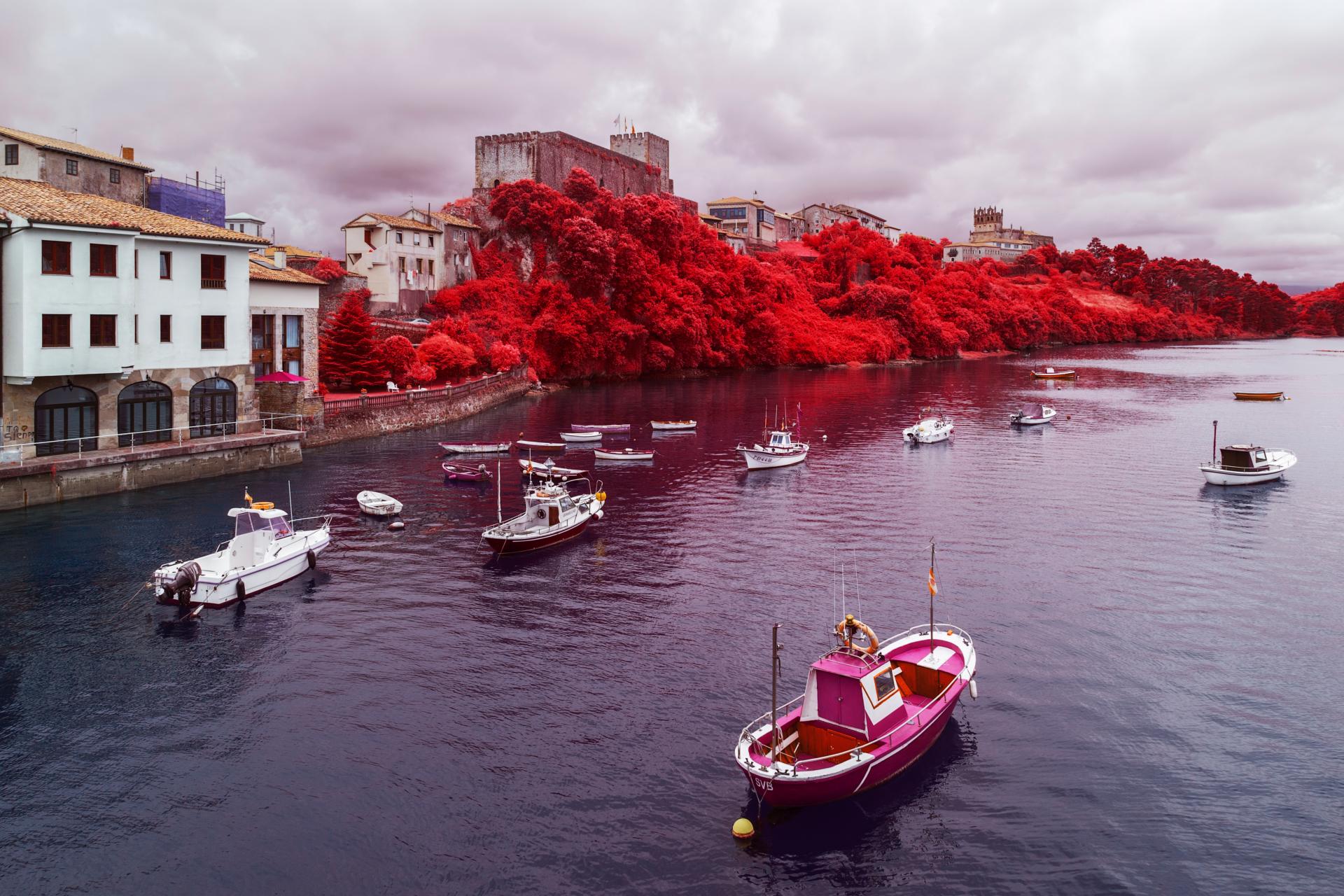 Port du village de San Vicente de la Barquera, sur la côte nord de l'Espagne, en Cantabrie. Technique de photographie infrarouge donnant à la végétation un rendu rouge vif dès la prise de vue.