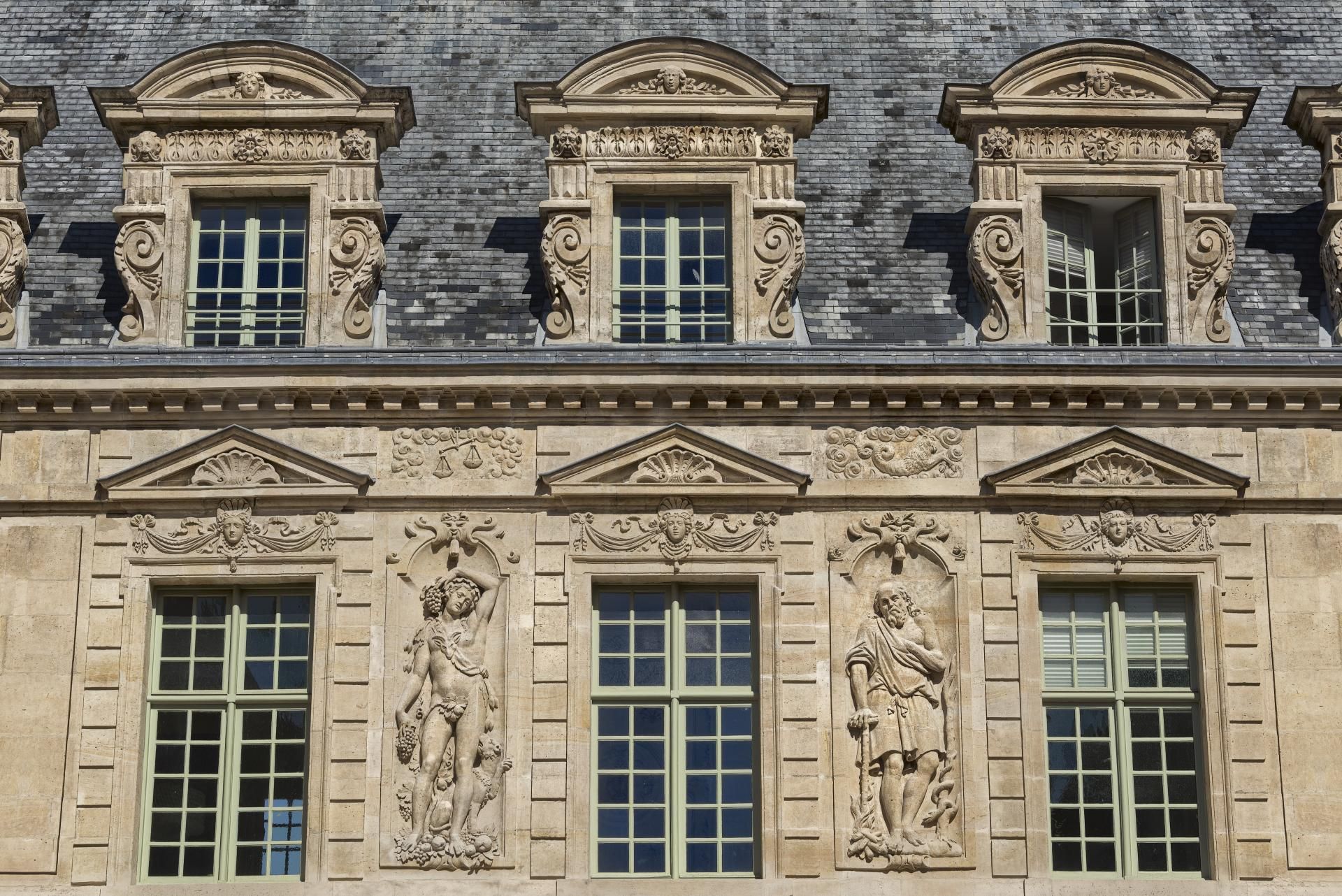 Des sculptures et fenêtres sur la façade de l’hôtel de Sully