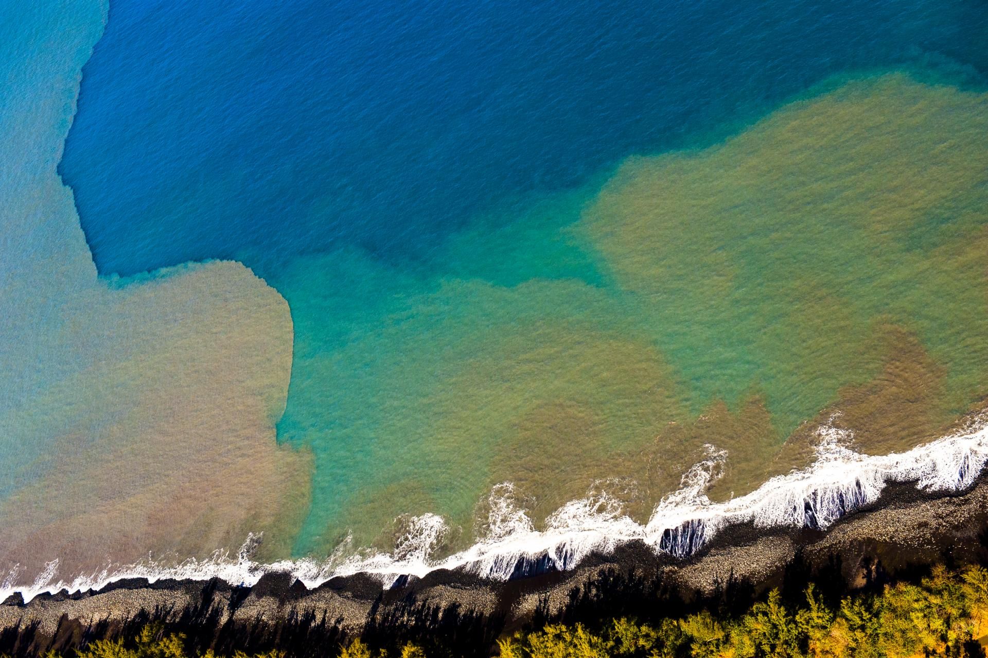 France, La Réunion, La Réunion vue du ciel en Ulm et son littoral ouest qui offre un concert de matières, de couleurs , et de formes éphémères tel ce visage. Les fonds sabloneux et coraliens cèdent la place aux grand bleu très près des côtes / West coast and its colorful tropical sea waters drawing imaginary scenes, La Reunion island, France