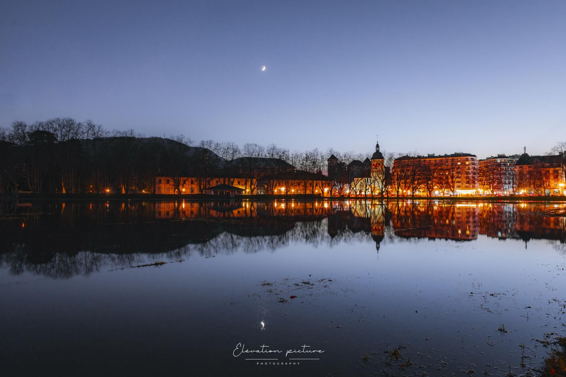 La ville d'Annecy sous les eaux. Photographie prise à la tombée du jour lors des inondations de cet automne 2023. Photographie en édition limitée
