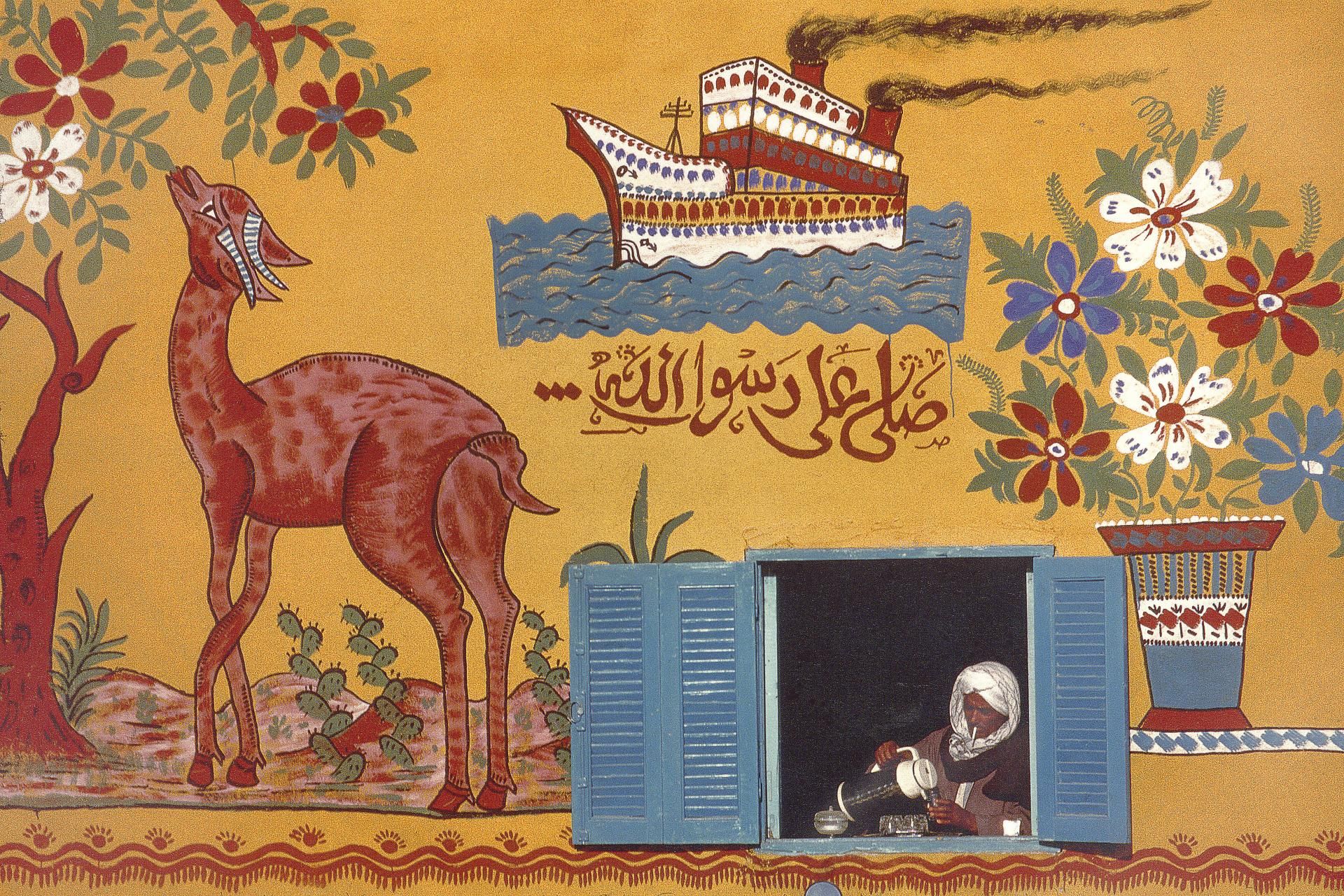 Egypte. Façade de maison à Louxor. Le propriétaire boit le thé à sa fenêtre.