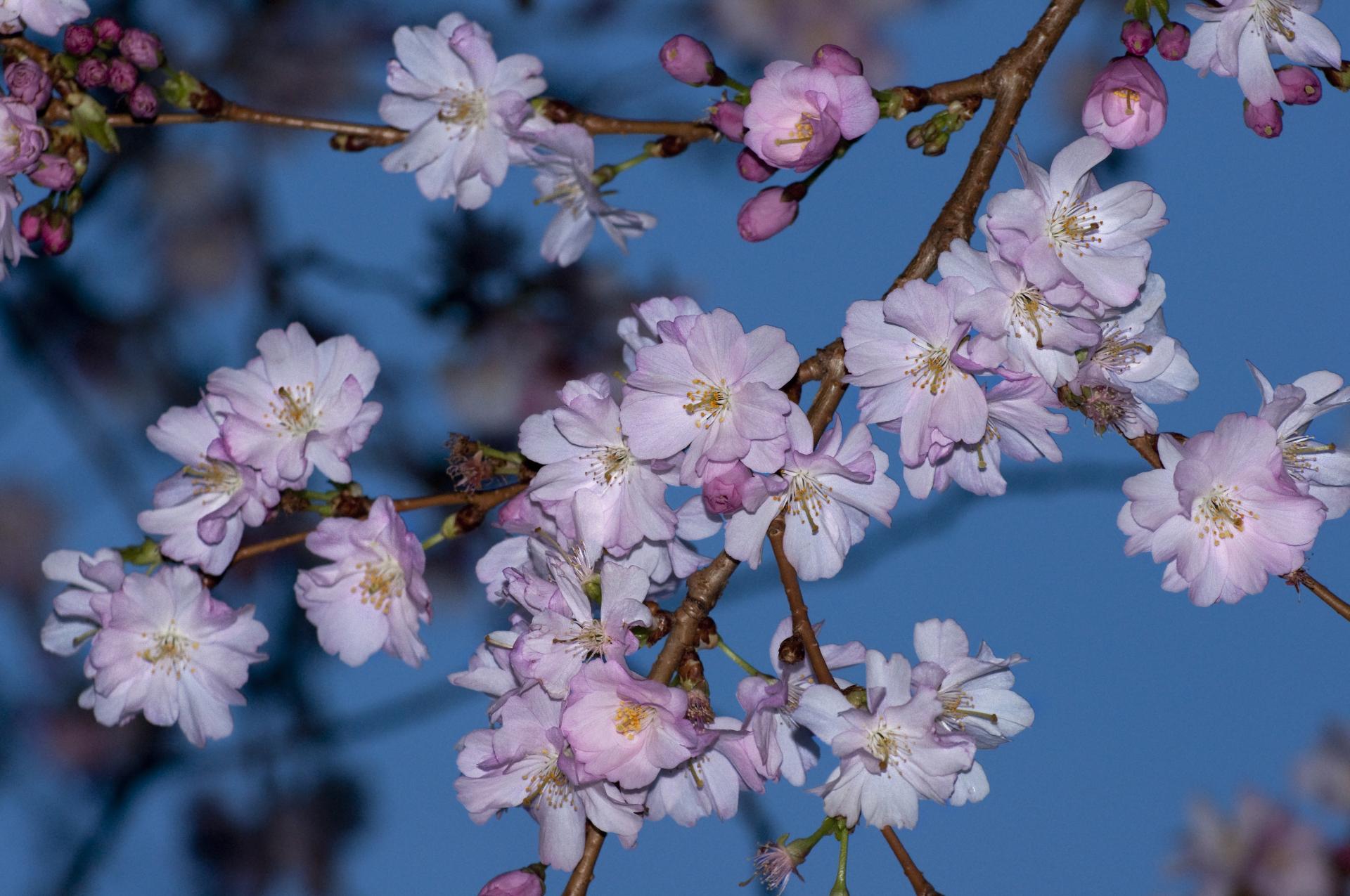 Des fleurs d’un cerisier rose du Japon en floraison dans un jardinet derrière la rue François Miron.