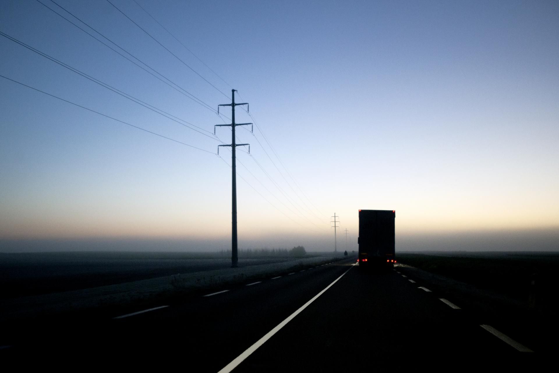 Vue sur une route nationale derriere un camion un matin d'hiver au lever du jour