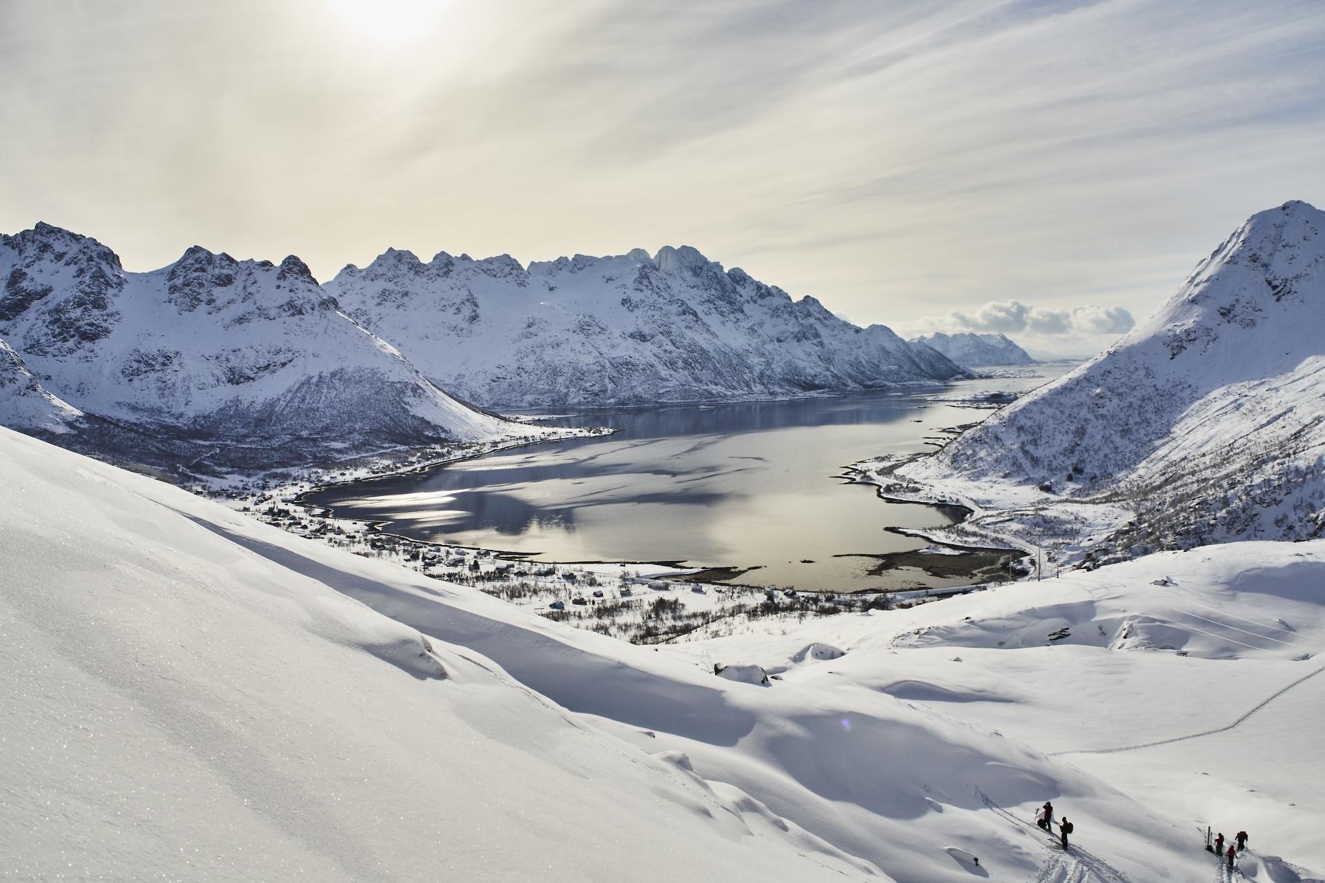 Norvège Lofoten rando à ski au Sautinden 650m : on part du bord de l'océan et on redescend en skiant face à l'océan