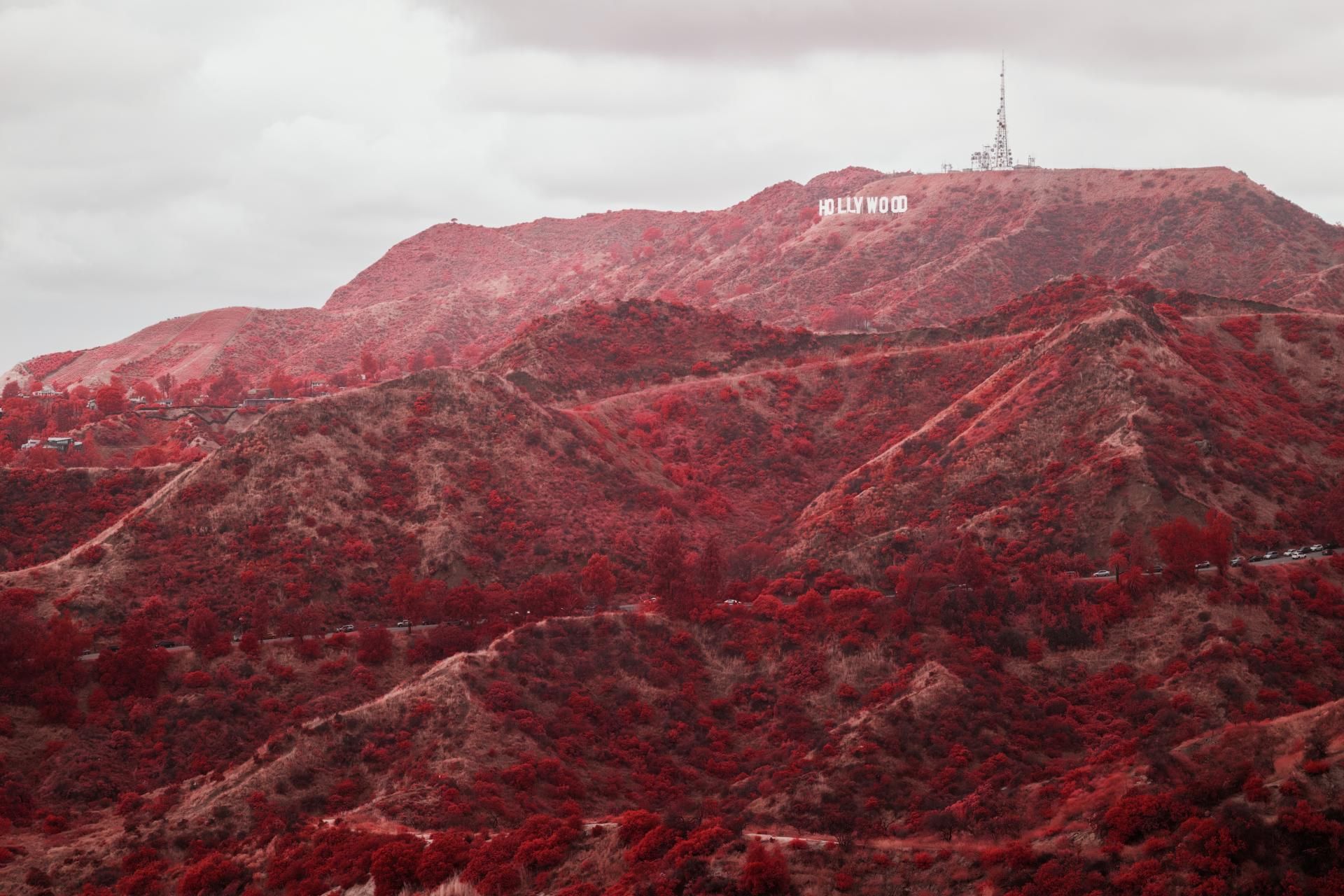 Colline de Hollywood à Los Angeles, depuis l'observatoire de Griffith. Technique de photographie infrarouge donnant à la végétation un rendu rouge vif dès la prise de vue.