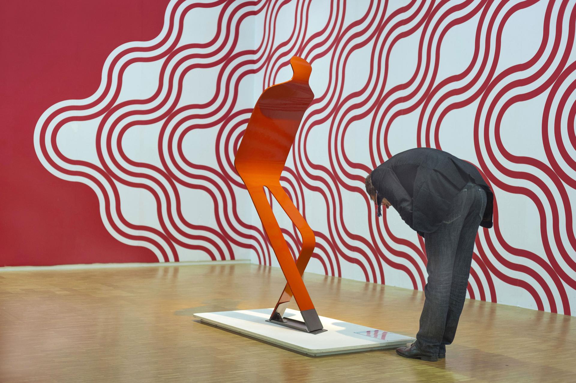 Paris. Musée Beaubourg. Visiteur devant une statue orange. 2012