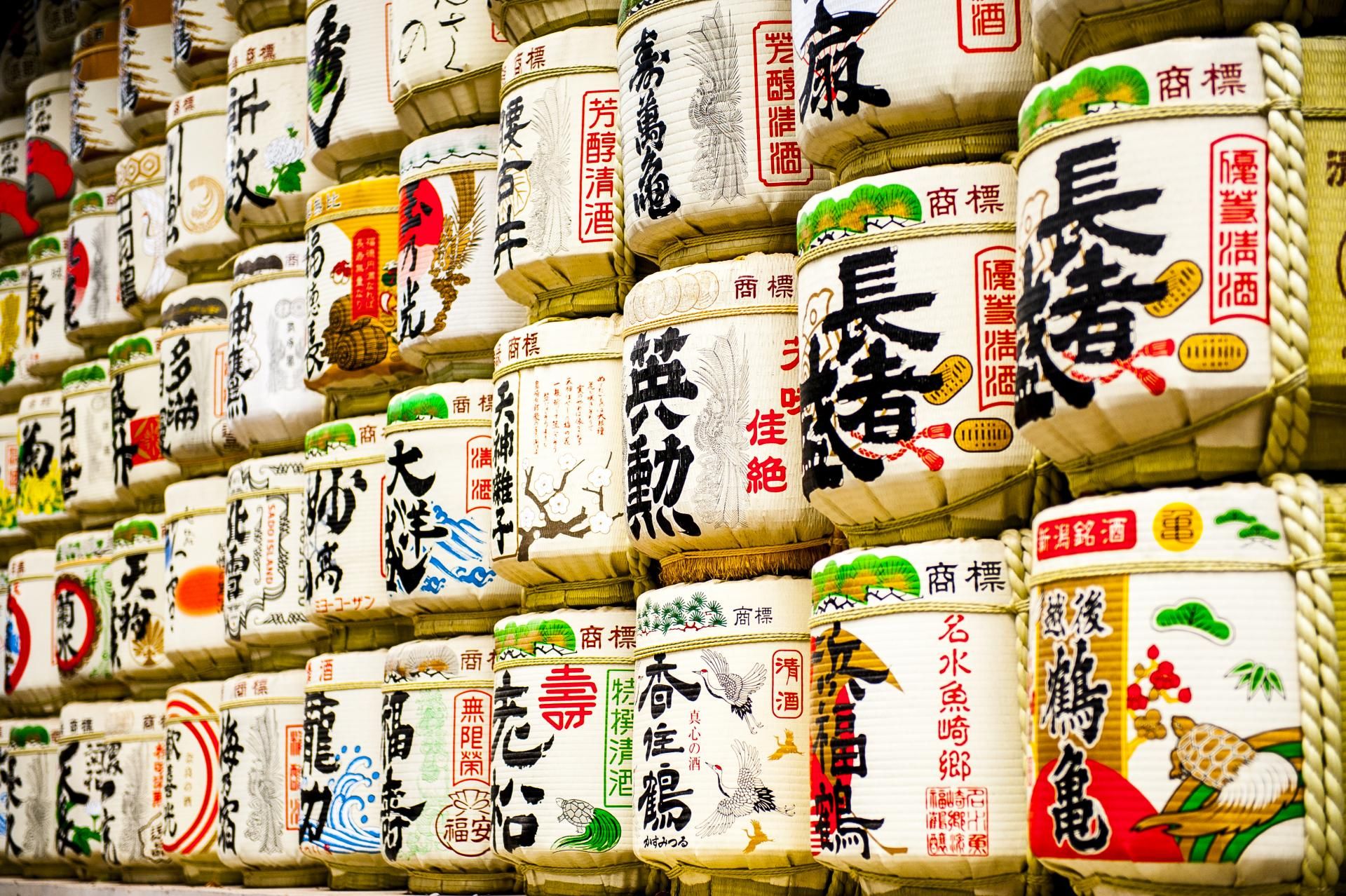 Japon, Tokyo, fûts de sake colorés traditionnellement alignés devant les temples / Colourful sake barrels in a row as it is showcases in temples, Tokyo, Japan