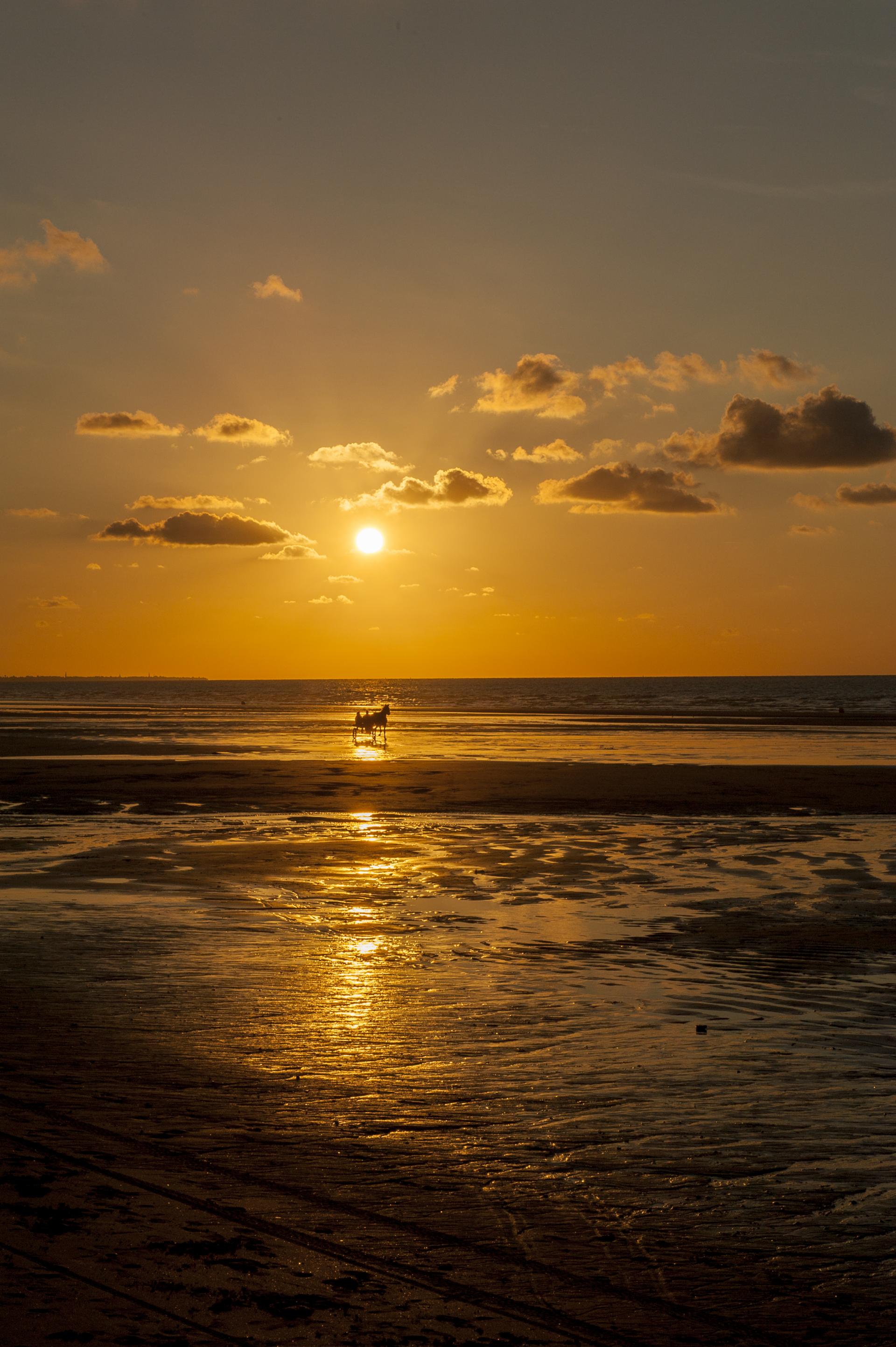 France, Cabourg, le coucher de soleil donne à voir toutes sortes de créatures, et bien sûr le ballet des attelages de chevaux de course / Horse training at low tide and sunset, France