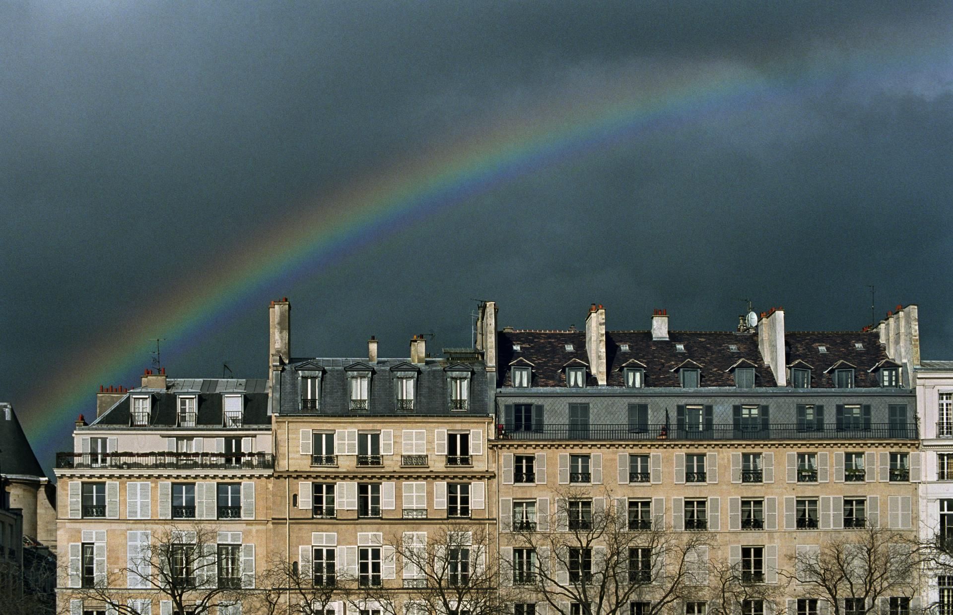 Un arc-en-ciel flotte au-dessus des bâtiments sur le quai de Béthune, vu du quai de la Tournelle sur la Rive gauche.