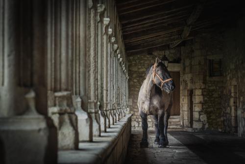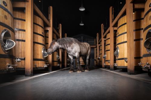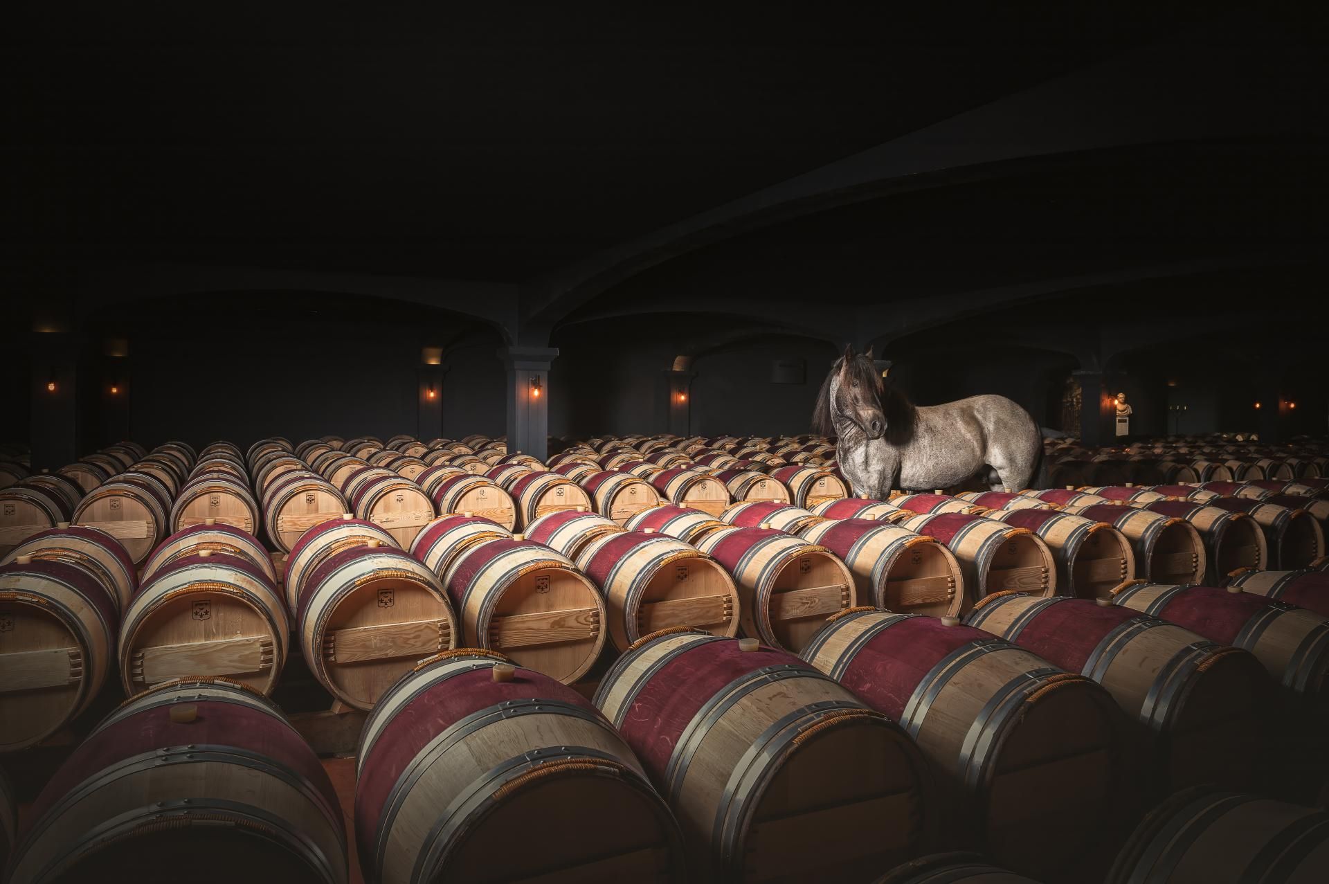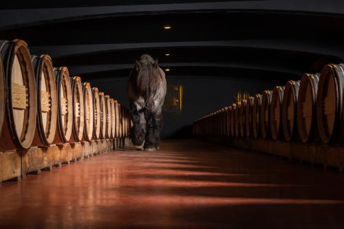 J’aime cette photo de Falco car il semble noyé au milieu de ces barriques. Ces mêmes contenants détenant le nectar des dieux patientant silencieusement, laissant le chêne s’imprégner, les tanins se former, le vieillissement des vins faire sa lente chimie en vue de devenir le précieux liquide gourmand qui va ravir les papilles de chacun. C’est aussi grâce au travail du cheval que ce vin existe. Il en aura permis l’évolution de la vigne et de ses sols, permettant ainsi au raisin de s’épanouir et se gorger de soleil et de sucres.