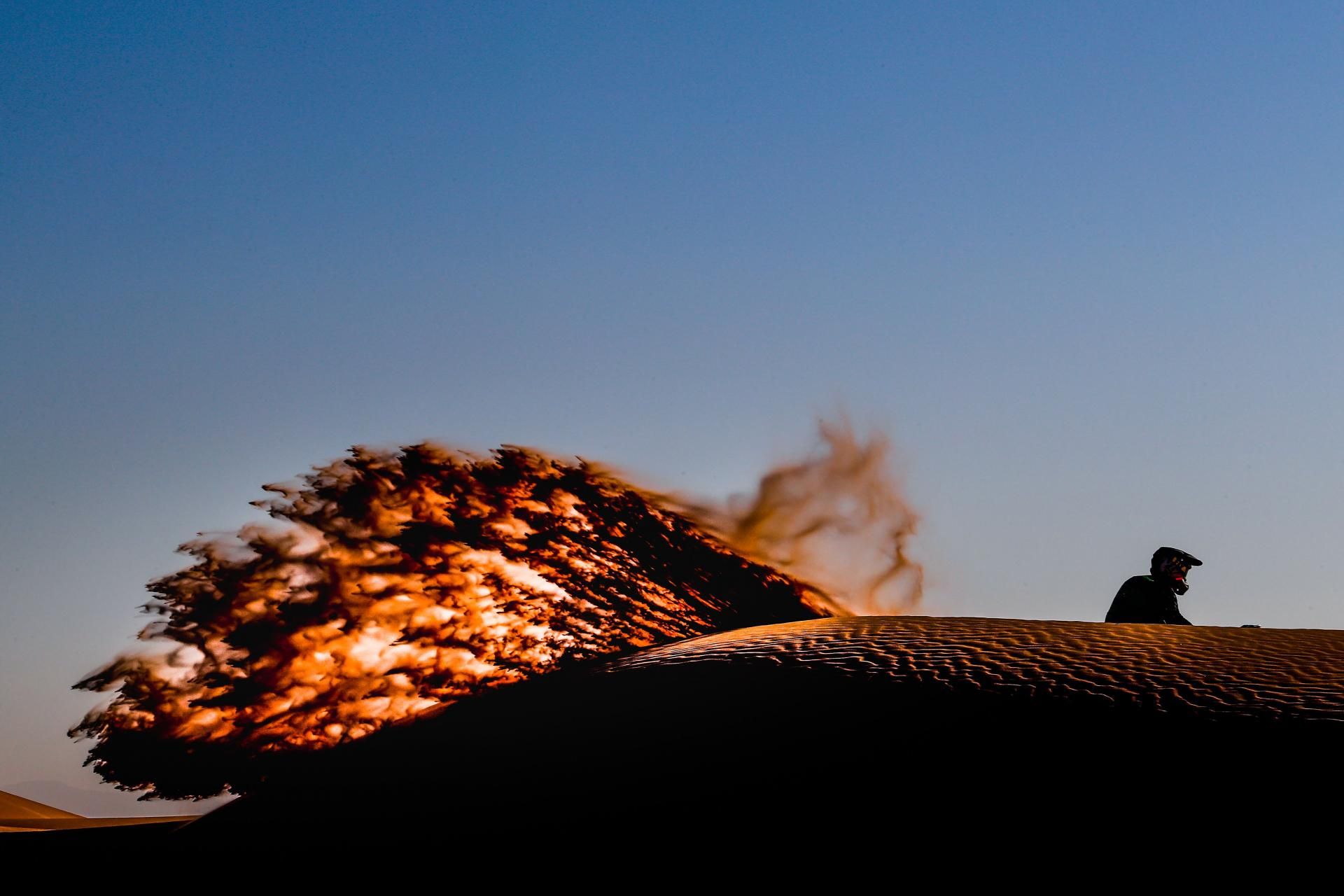 Depuis la création des rallyes-raid, les franchissements de dunes sont l'un des moments redoutées par les motards. Au guidon de leur moto, il n'est jamais simple de naviguer à travers les multiples cordones de dunes. Pour autant, ces passages offrent l'un des plus belles effets graphiques pour nos photographes avec de jolies gerbes de sable s'envolant dans les airs.