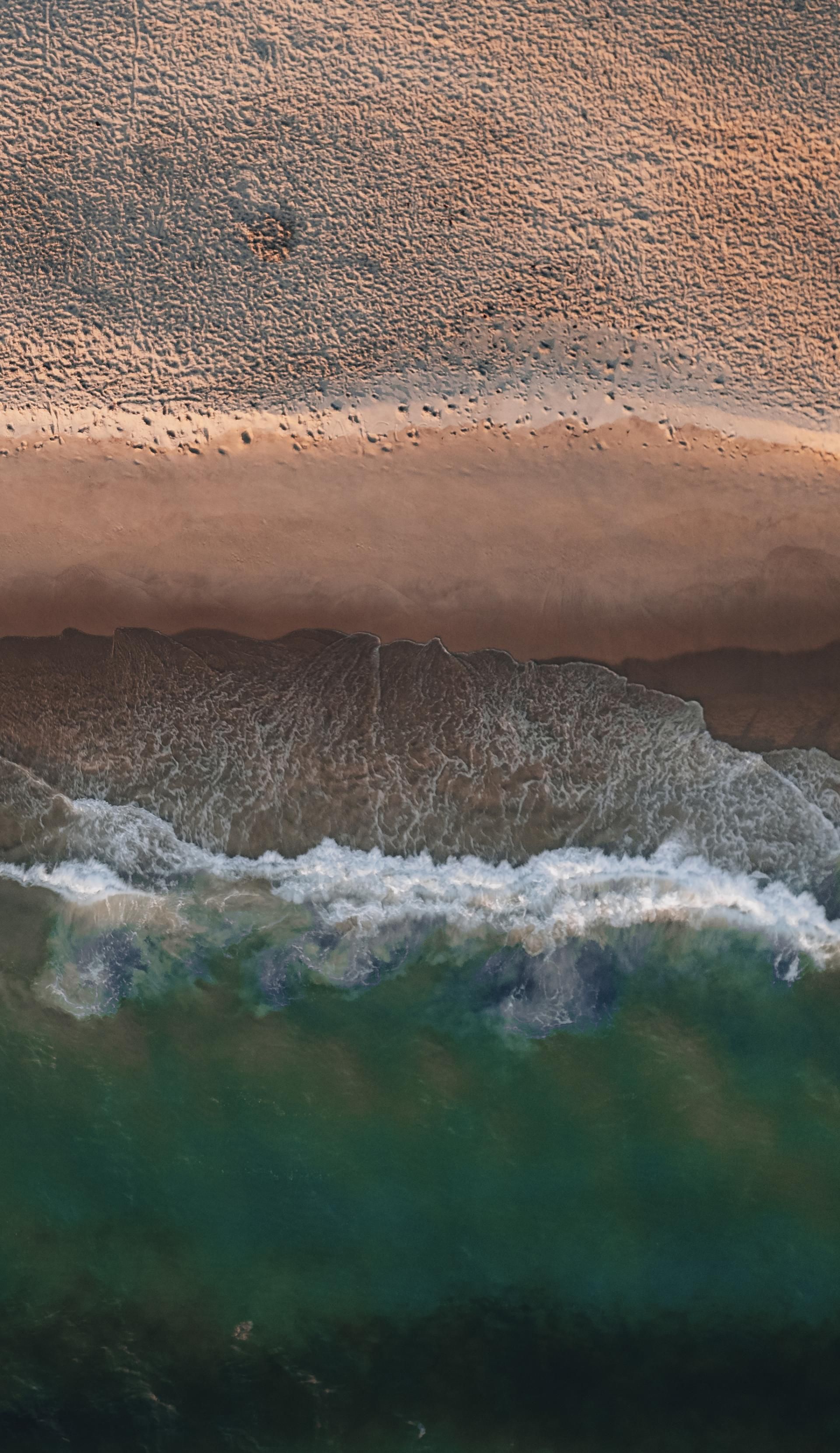 Photographie prise an drone au dessus d'un plage au Portugal au petit matin, La où la couelur de l'océan danse avec la couleur orangé du sable.