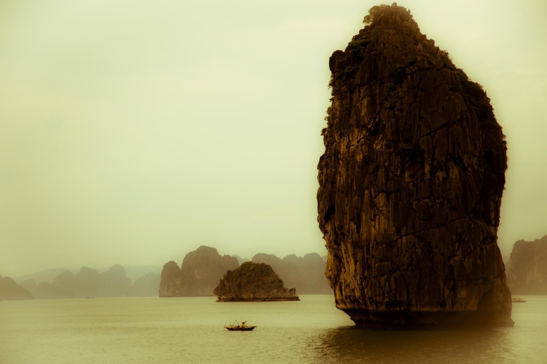 Vietnam, Baie d'Halong, un sampan comme une fourmi au pied des colosses de roche toujours un peu brumeux. La baie n'était alors pas noyée de bateaux de tourisme / Boat at the foot of huge rock in Halong bay, Vietnam
