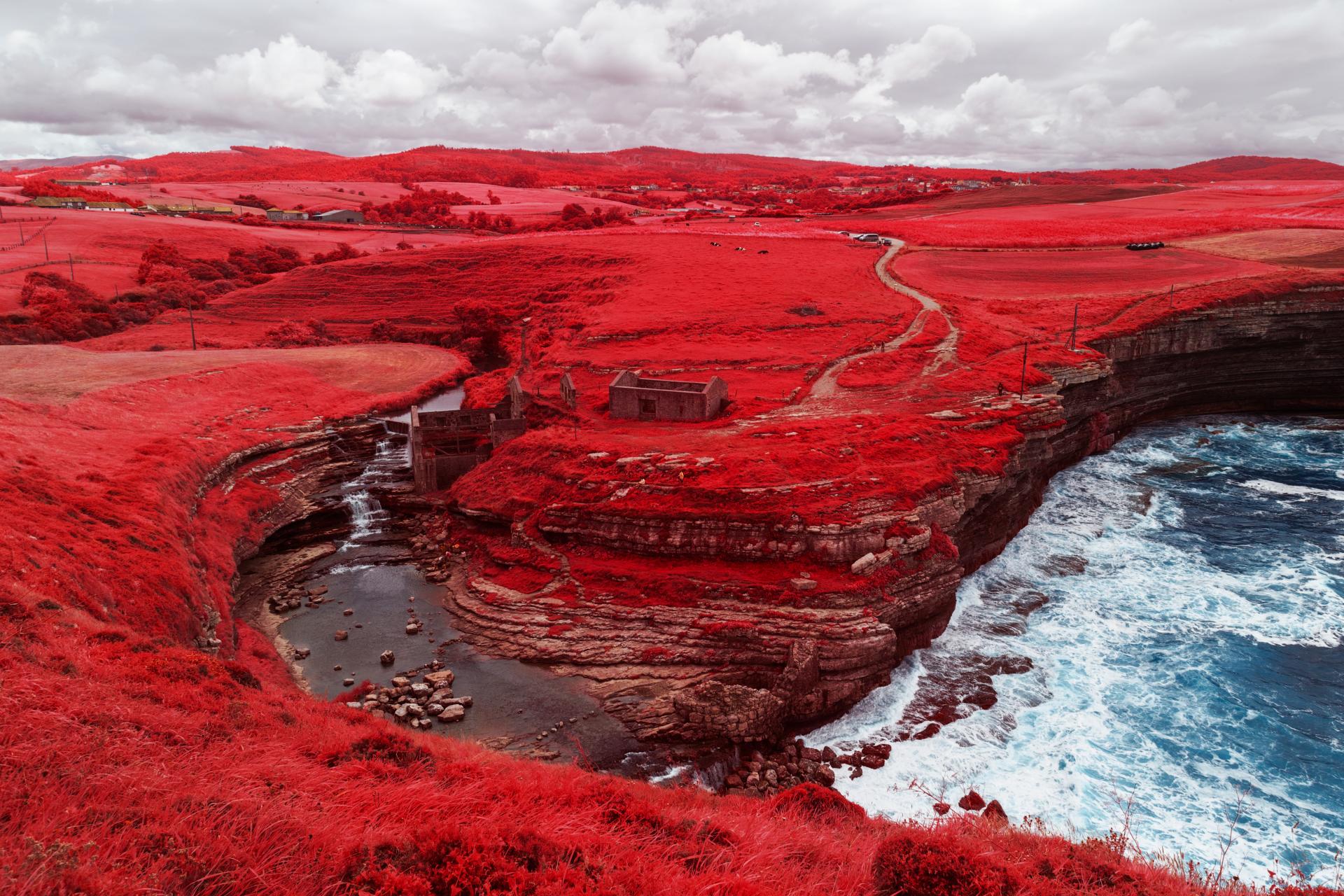 Molino de Bolao, ruines d'un ancien moulin en bord d'océan sur la côté nord de l'Espagne, en Cantabrie. Technique de photographie infrarouge donnant à la végétation un rendu rouge vif dès la prise de vue.