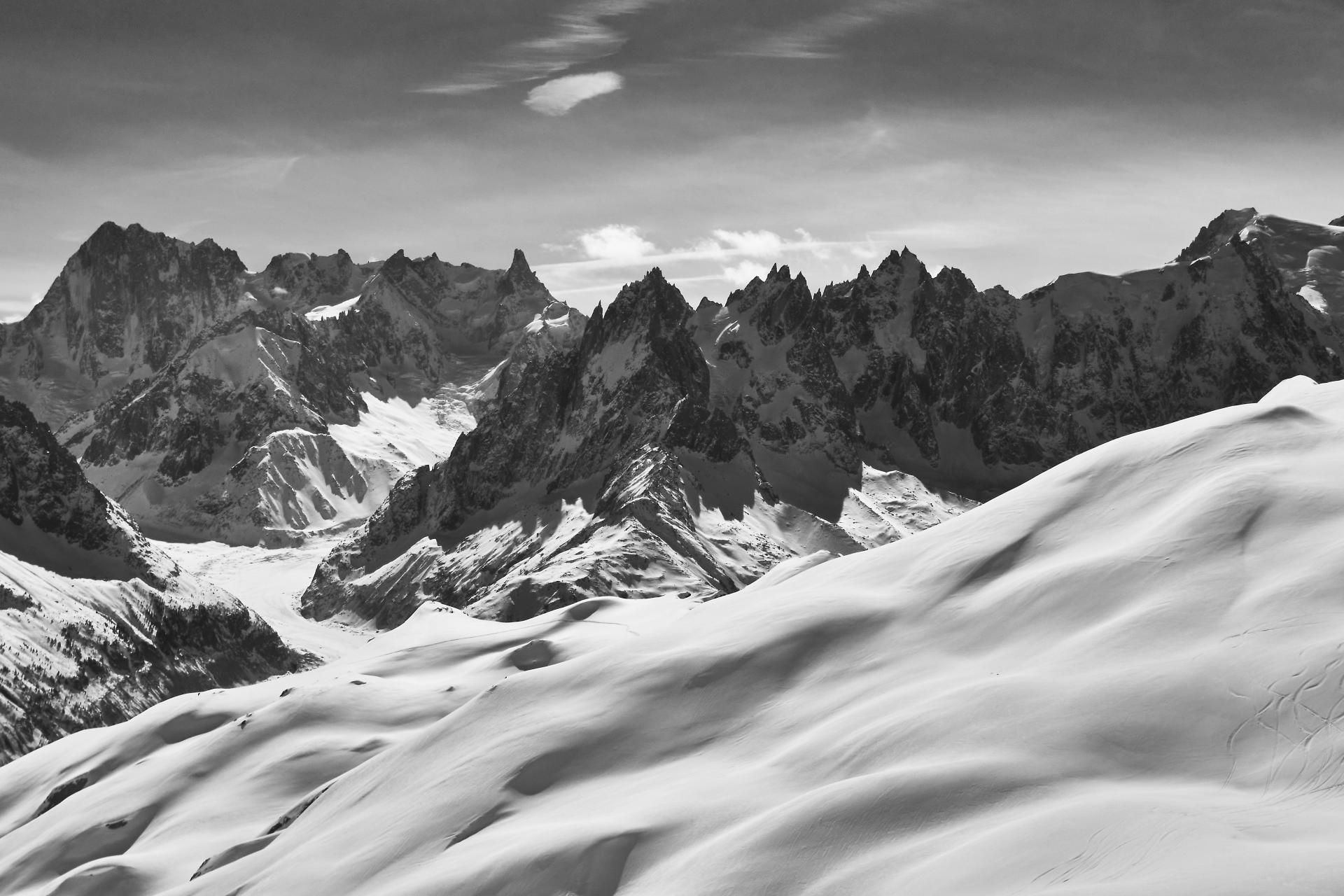 Vue depuis le col du Belvédère 2780m, de gauche à droite : les Grandes Jorasses 4200m, la Dent du Géant 4013m, en avant : l' Aiguille des Grands Charmoz 3445m, l' Aiguille du Grépon 3482m, l'Aiguille de Blaitière 3522m.